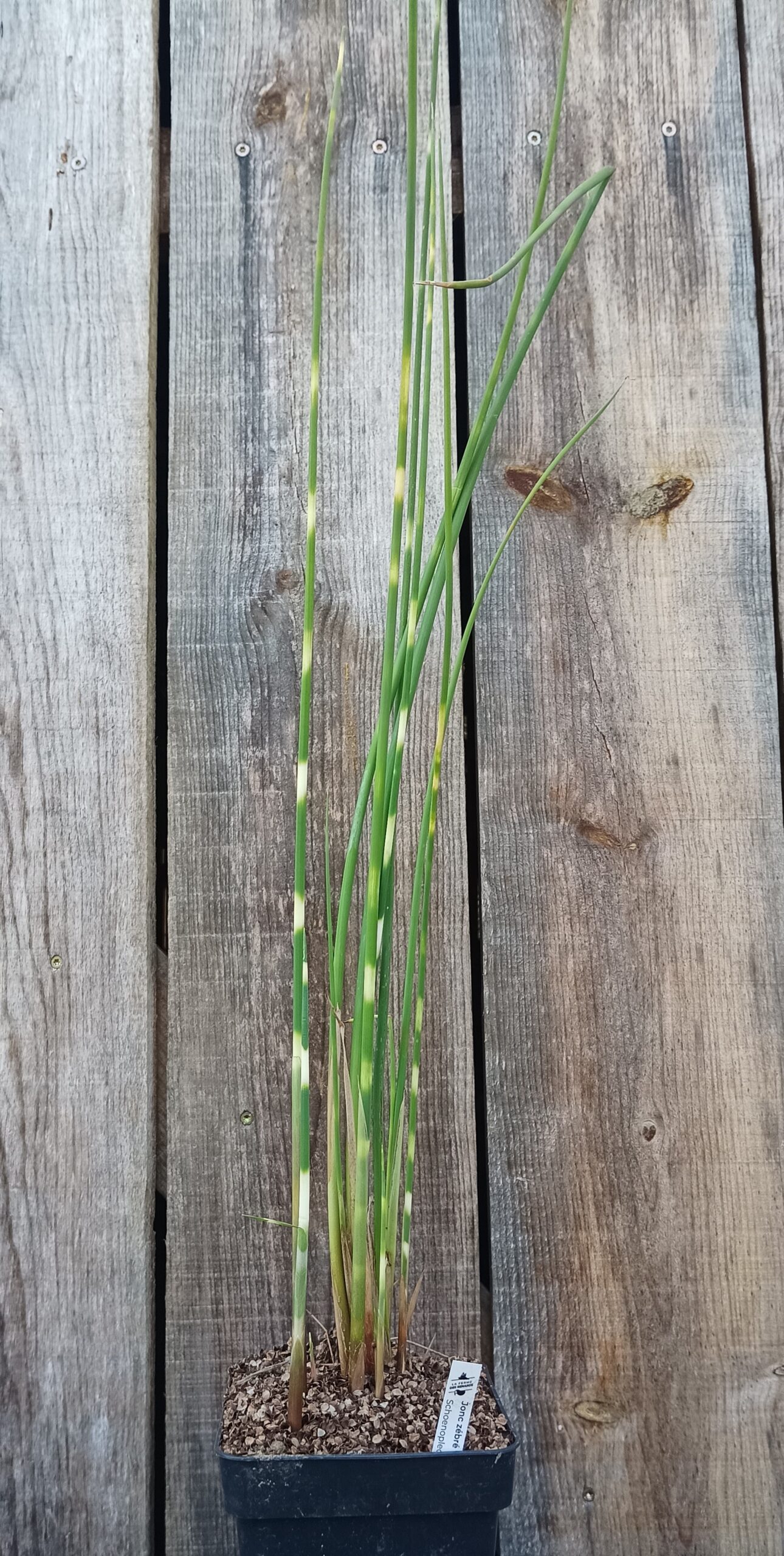 Le jonc zébré (Schoenoplectus tabernaemontani ‘Zebrinus’) est une plante vivace aquatique de la famille des Cyperacées, appréciée pour ses tiges dressées vertes portant des anneaux jaunes horizontaux très décoratifs. Idéal pour les bassins, mares ou jardins aquatiques, il apporte structure, verticalité et un intérêt esthétique tout au long de la saison.