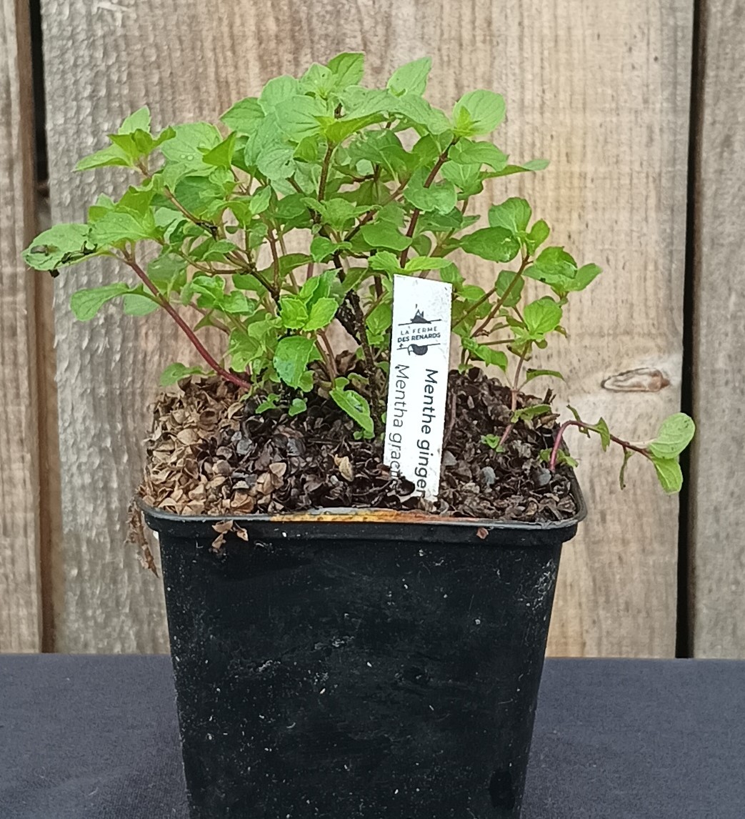 La Menthe Gingembre (Mentha gracilis ‘Ginger’) est une plante vivace aromatique de la famille des Lamiacées, originaire d’Asie. Elle est appréciée pour son feuillage vert aromatique dégageant un parfum légèrement épicé rappelant le gingembre, idéal pour infusions, desserts ou cocktails.
