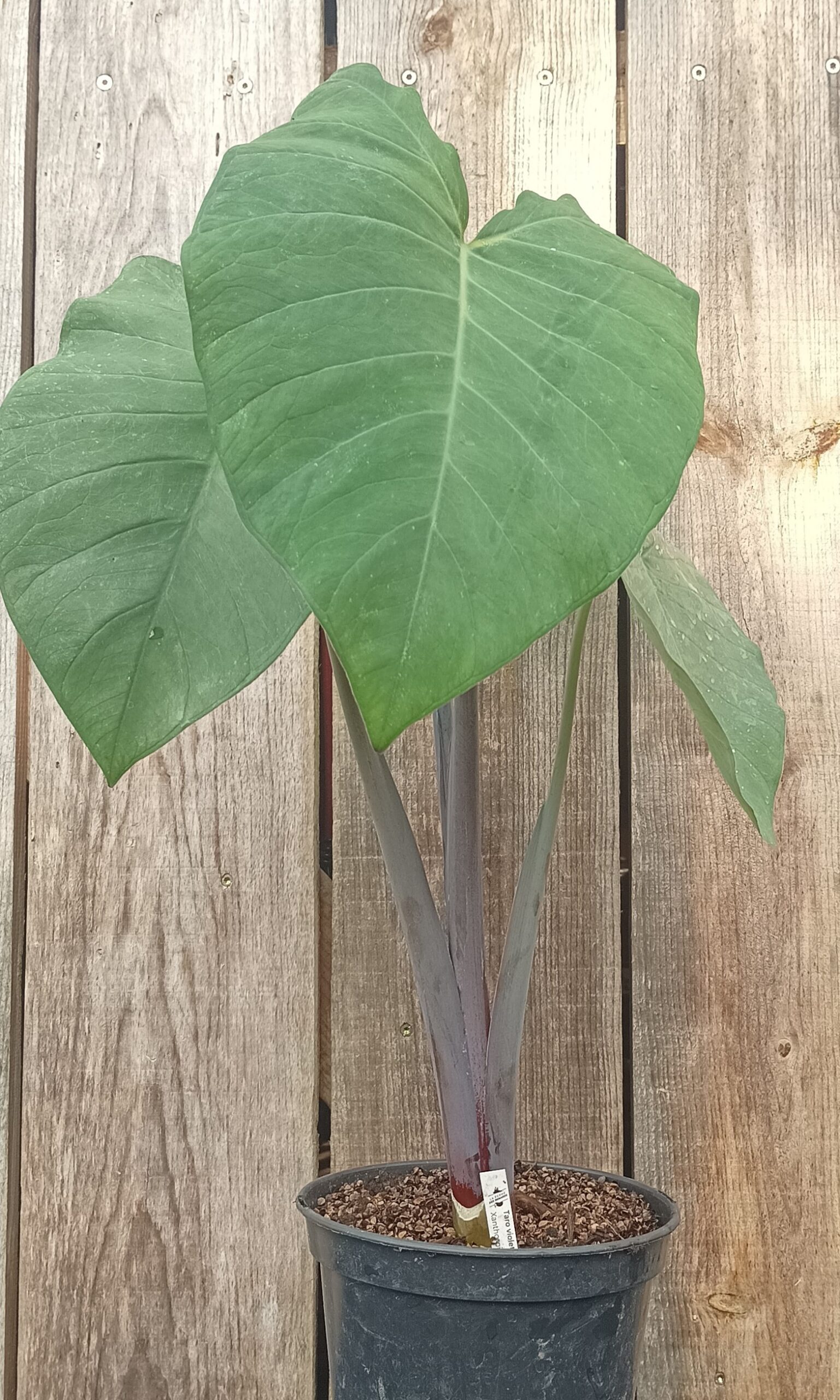 Le taro violet (Xanthosoma violaceum) est une plante tropicale de la famille des Aracées, cultivée pour ses grands feuillages décoratifs et ses rhizomes comestibles. Son feuillage vert veiné de pourpre et ses pétioles violets lui donnent un aspect très ornemental.